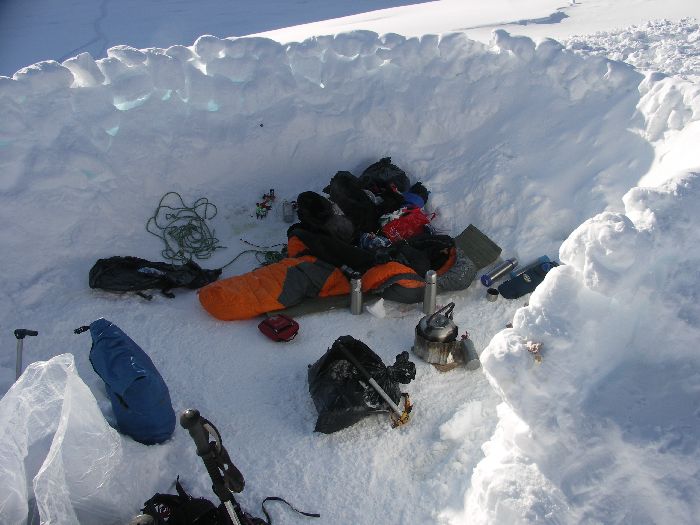 Mein Schlafplatz im Freien - am High Camp in ca. 5250 m (17200 ft) bei ca. -27ºC - bestens ausgerüstet habe ich geschlafen wie ein Murmeltier :-) |